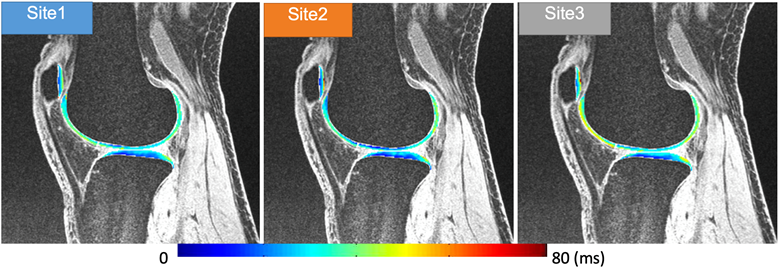 MR T1ρ and T2 relaxation times  have shown to be promising imaging biomarkers for early cartilage degeneration, and prediction of disease progression.  However, many challenges to clinically applying these techniques remain,  including lack of standardized acquisition and quantification methods, and long  acquisition time. We have implemented MAPSS T1ρ and T2  imaging sequences on three major MR platforms (Siemens, GE and Philips) and  have performed multisite multivendor cross validation and reproducibility  evaluation, sponsored by the Arthritis Foundation. The next step is to develop  fast T1ρ and T2 imaging techniques using novel  MRI reconstruction and evaluate the reproducibility and clinical significance  of the technique in a multivendor multicenter setting in volunteers and patients  with osteoarthritis. A dedicated MSK calibration phantom will be also  developed.