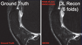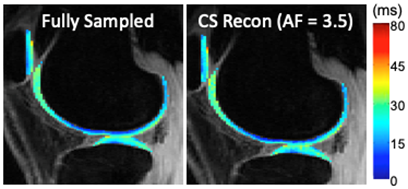 We have developed algorithms combining an advanced CS  based reconstruction technique, LAISD, and an advanced parallel imaging  technique, JSENSE, and achieved superior quantitative accuracy for T1ρ  quantification with AF up to 4. We will further develop model-based CS  techniques to take full advantage of the known quantitative model for T1ρ and  T2 decay such that the estimated T1ρ and T2  maps are more robust to noise. We are also working on develop novel MR  reconstruction algorithm using deep learning techniques. Compared to CS, one  advantage of machine learning methods is the fast image reconstruction. With a  15-layer convolutional neural network (CNN), we have reduced the acquisition  time 6 times without significantly affecting the image quality, as well as  clinical grading and diagnostic capability. We are currently working on  developing DL reconstruction algorithm for cartilage relaxation time  quantification, for both mono- and bi-exponential decay components.